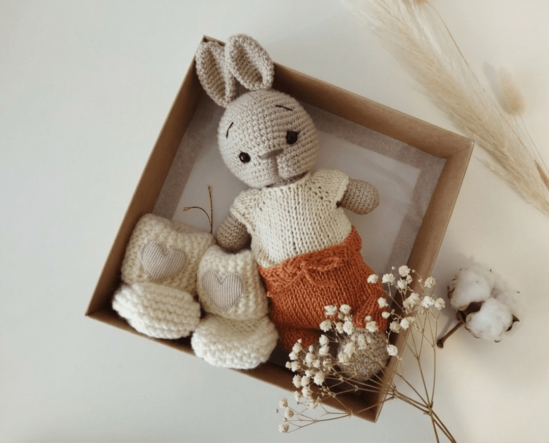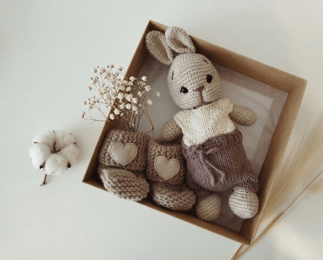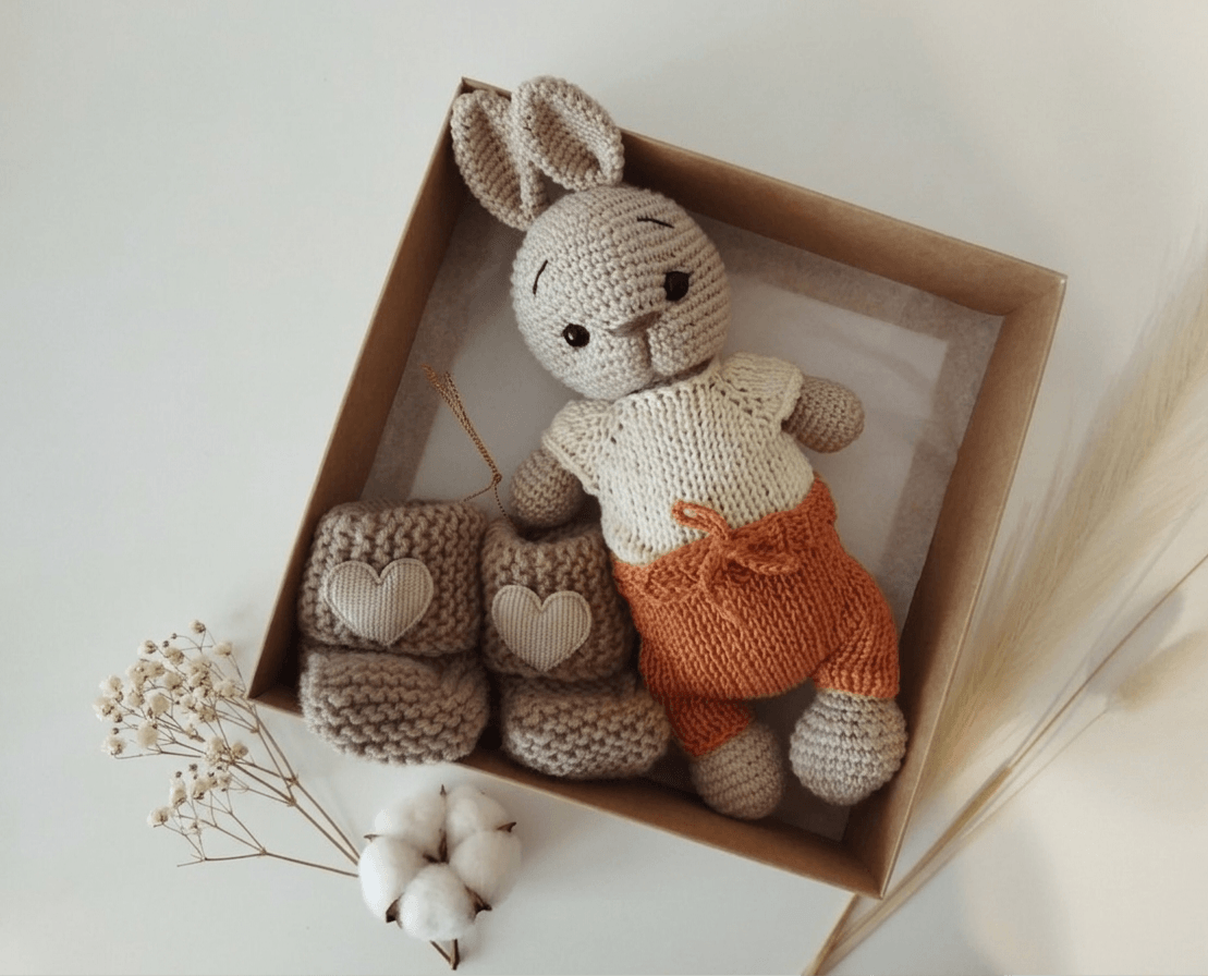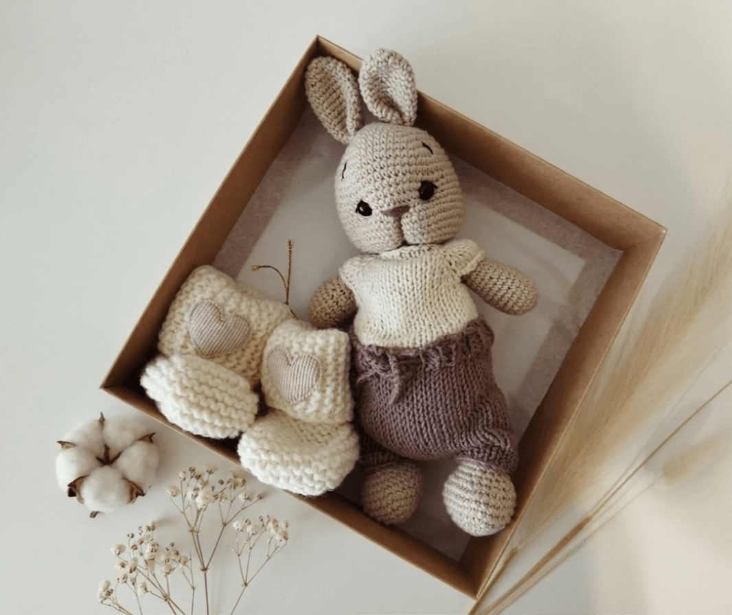Rankų darbo gaminiai pasižymi kruopščiu mezgimu ir ypatingu dėmesiu detalėms. Dėl to šis kiškučio ir tapukų rinkinys dažnai pasirenkamas kaip graži ir prasminga dovana lankynoms, krikštynoms ar kūdikio sutiktuvėms. Tai ne tik dovana, bet ir šiltas prisiminimas, kuris gali išlikti šeimos istorijoje ilgą laiką.