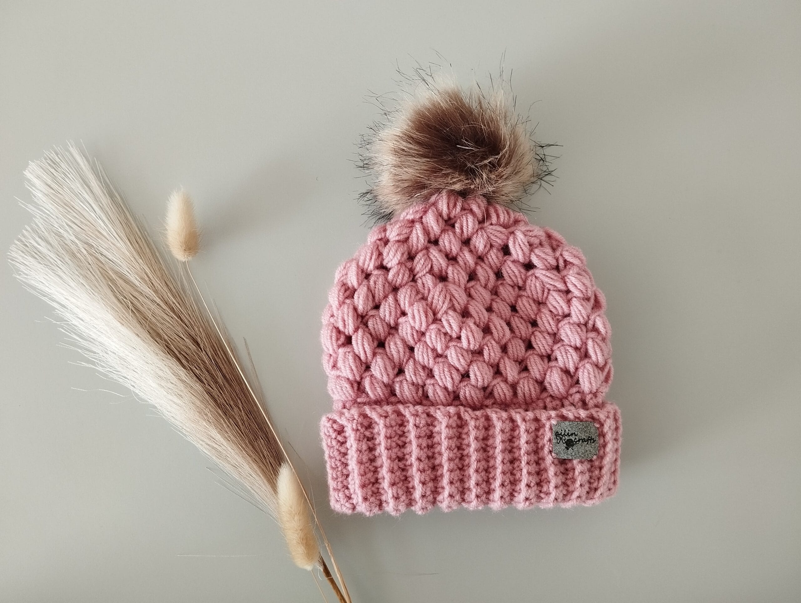 Šių kepuryčių raštas išsiskiria išskirtiniais „bumbuliukais“, kurie suteikia mezginiui tūrio, minkštumo ir išskirtinės tekstūros. Nuotraukoje matomi keli spalviniai variantai – nuo švelnios kreminės ir pastelinių tonų iki sodresnių rožinių ar pilkų atspalvių. Visi jie derinami su minkštu, puriu kailiuku puošto bumbulo akcentu, kuris kiekvienai kepurytei suteikia žaismingumo ir žiemos šventiškumo.