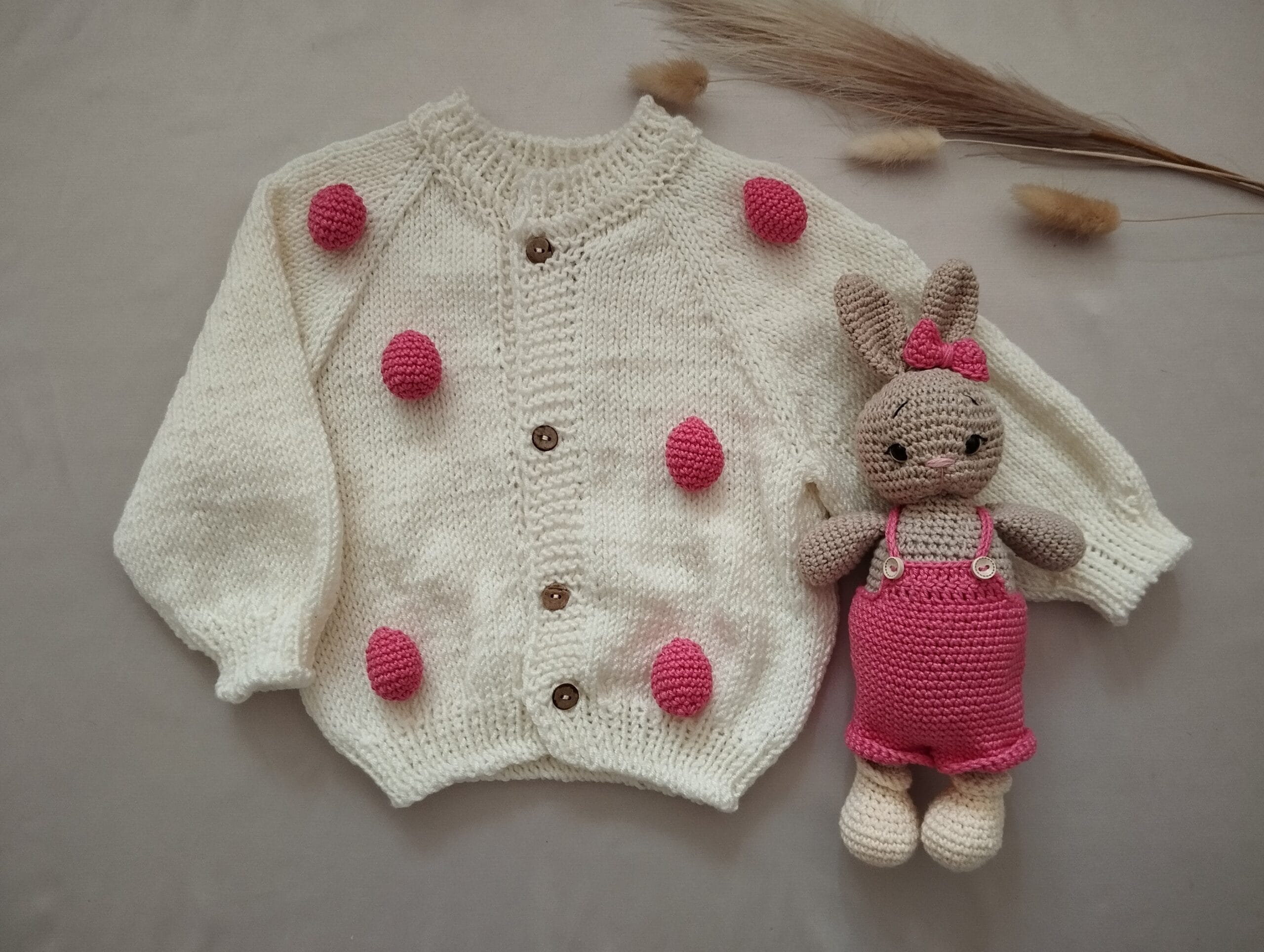 Nertas kiškutis ir medvilnės megztuko rinkinys yra ne tik žaislas, bet ir jaukus draugas, kuris gali lydėti vaiką darželyje ar namuose. Kiškutis skatina vaiko vaizduotę, taps patikimu žaidimų partneriu ir draugu per kasdienes nuotykių akimirkas. Megztukas suteikia komforto jausmą, saugo mažylį nuo vėsos ir puikiai derinasi su kitais kūdikių drabužiais.
