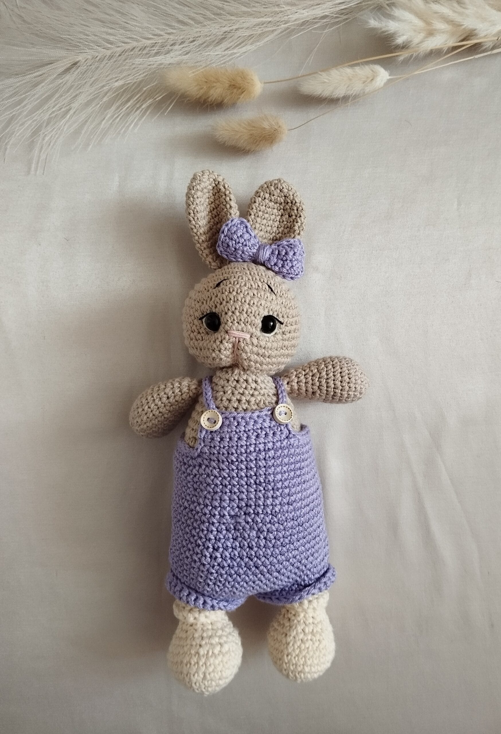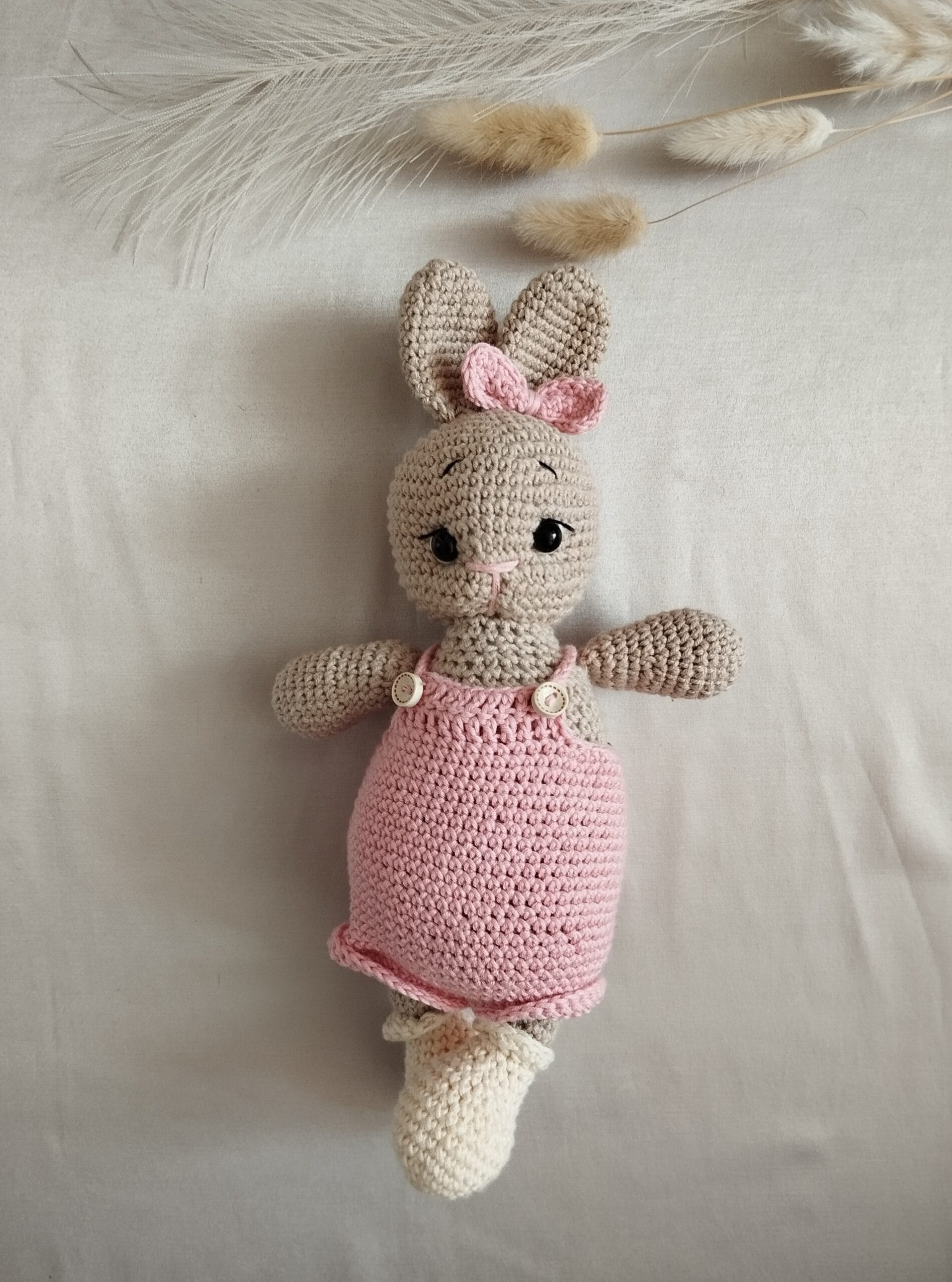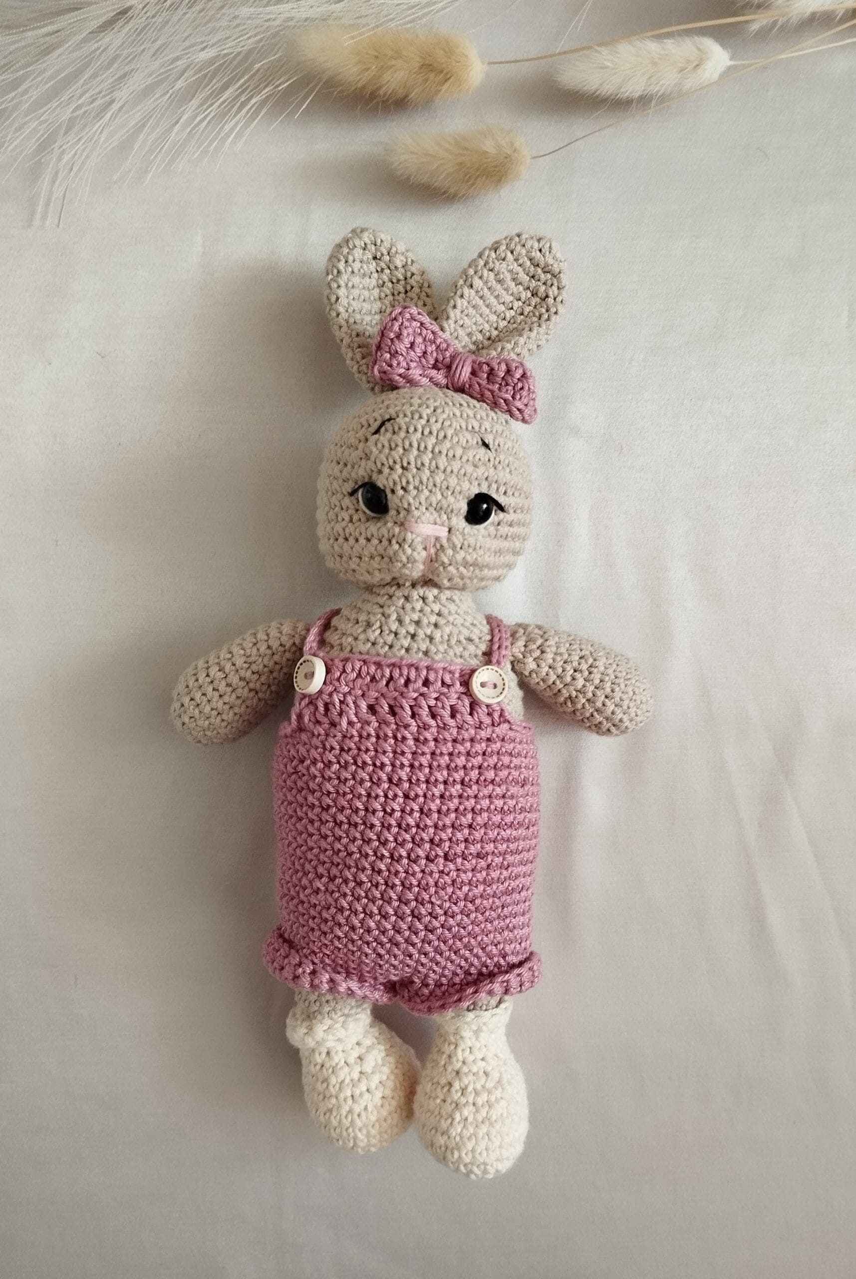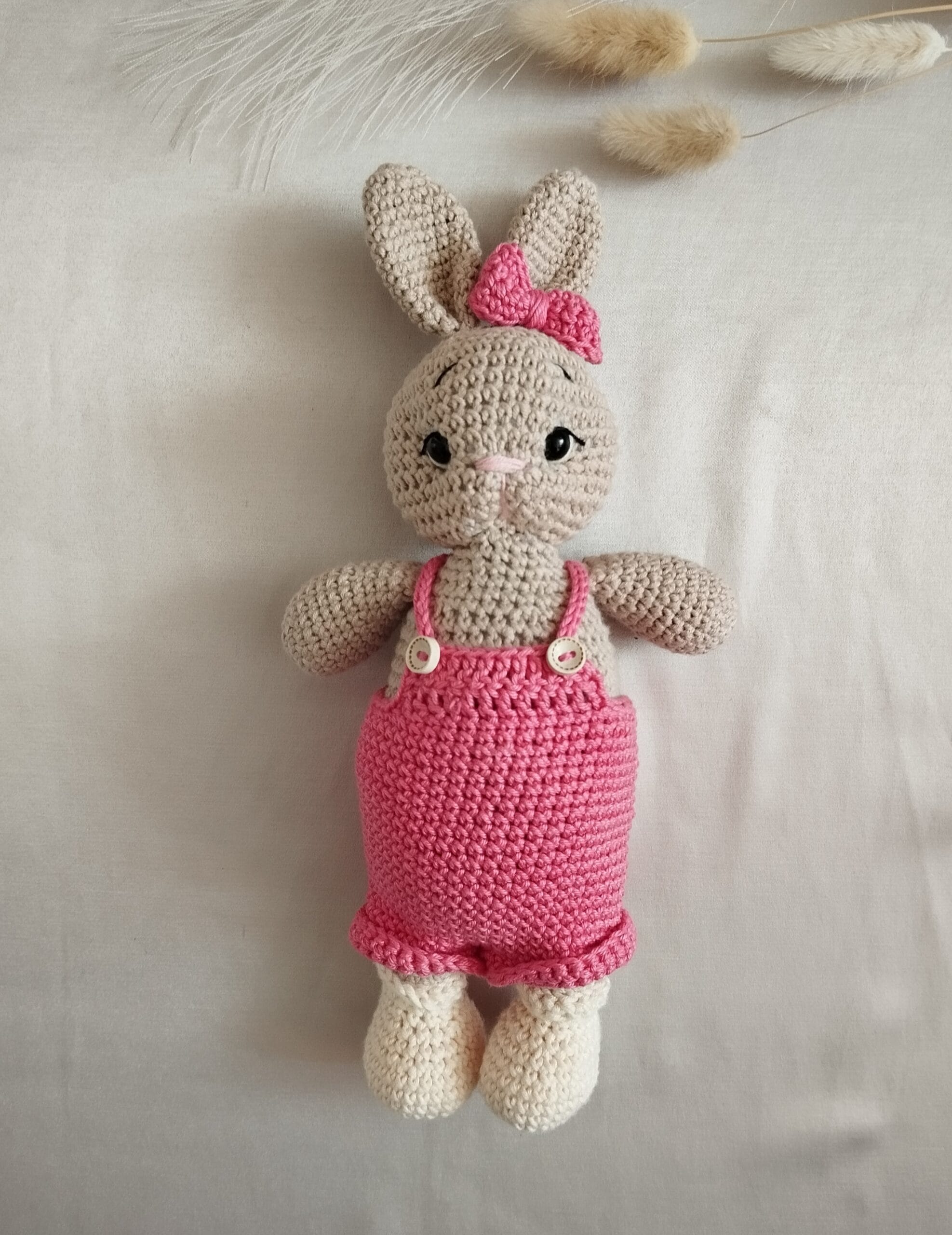 Nuotraukoje matomi kiškučiai pasipuošę įvairių spalvų drabužėliais: švelnia rožine, sodria rausva, pasteliniu violetiniu ir kitais mielais atspalviais. Maži šortukai ir smulkūs kombinezonai suteikia žaisliukams gyvumo – kiekvienas atrodo tarsi turėtų savo asmenybę. Šie rūbeliai mezgami specialiai taip, kad būtų tvirtai pritvirtinti ir saugūs žaisti net patiems mažiausiems vaikams. Nėra jokių smailių ar pavojingų smulkių dalių kurios nebūtų gerai pritvirtintos – viskas apgalvota tėvų ramybei ir mažylio saugumui.