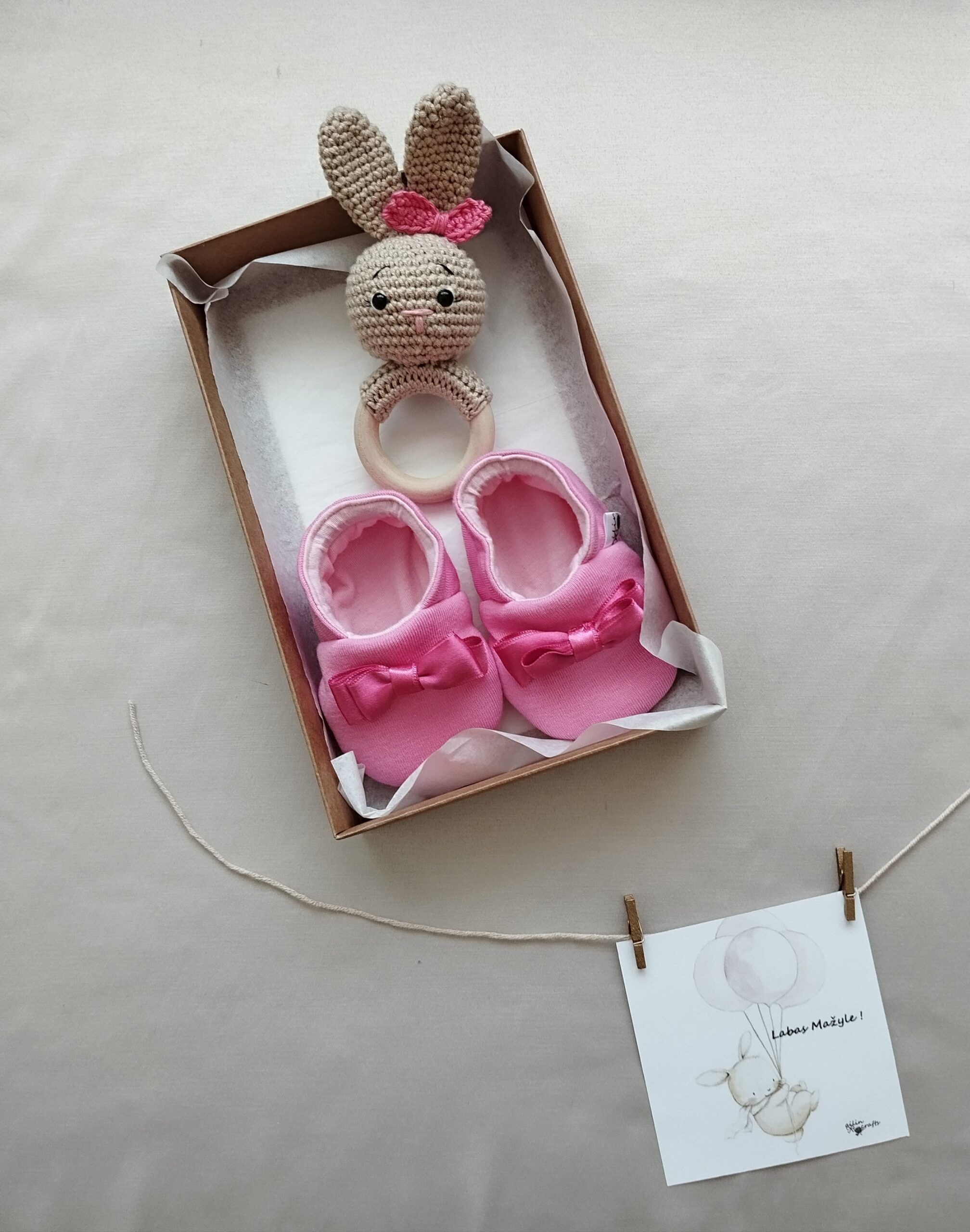 Rankomis siūti batukai švelniai apgaubs mažas kojytes, o mielas barškutis ne tik džiugins mažylį, bet ir skatins smalsumą ir pojūčių lavinimą.