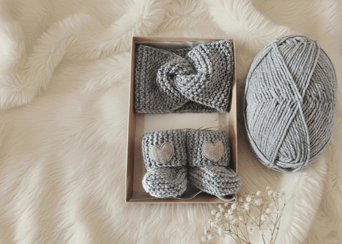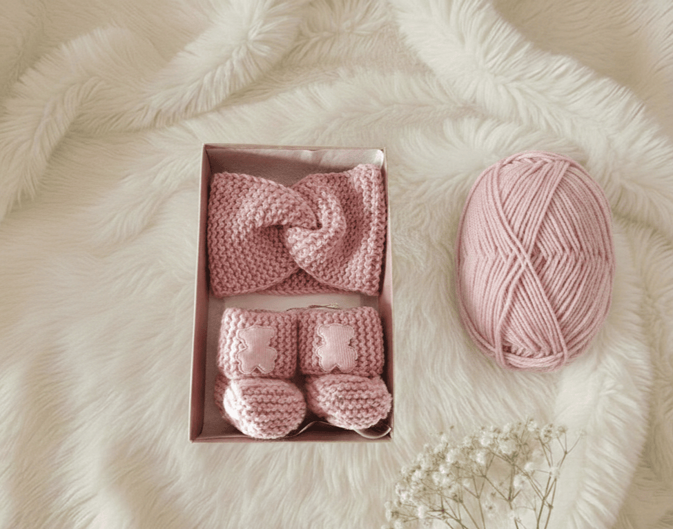 Minkšta, nespaudžianti galvajuostė subtiliai papuošia įvaizdį, o rankomis megzti tapukai saugo mažas kojytes ir leidžia odelei kvėpuoti. 49 % merino vilna suteikia natūralų komfortą, o kruopštus mezgimas užtikrina ilgaamžiškumą.