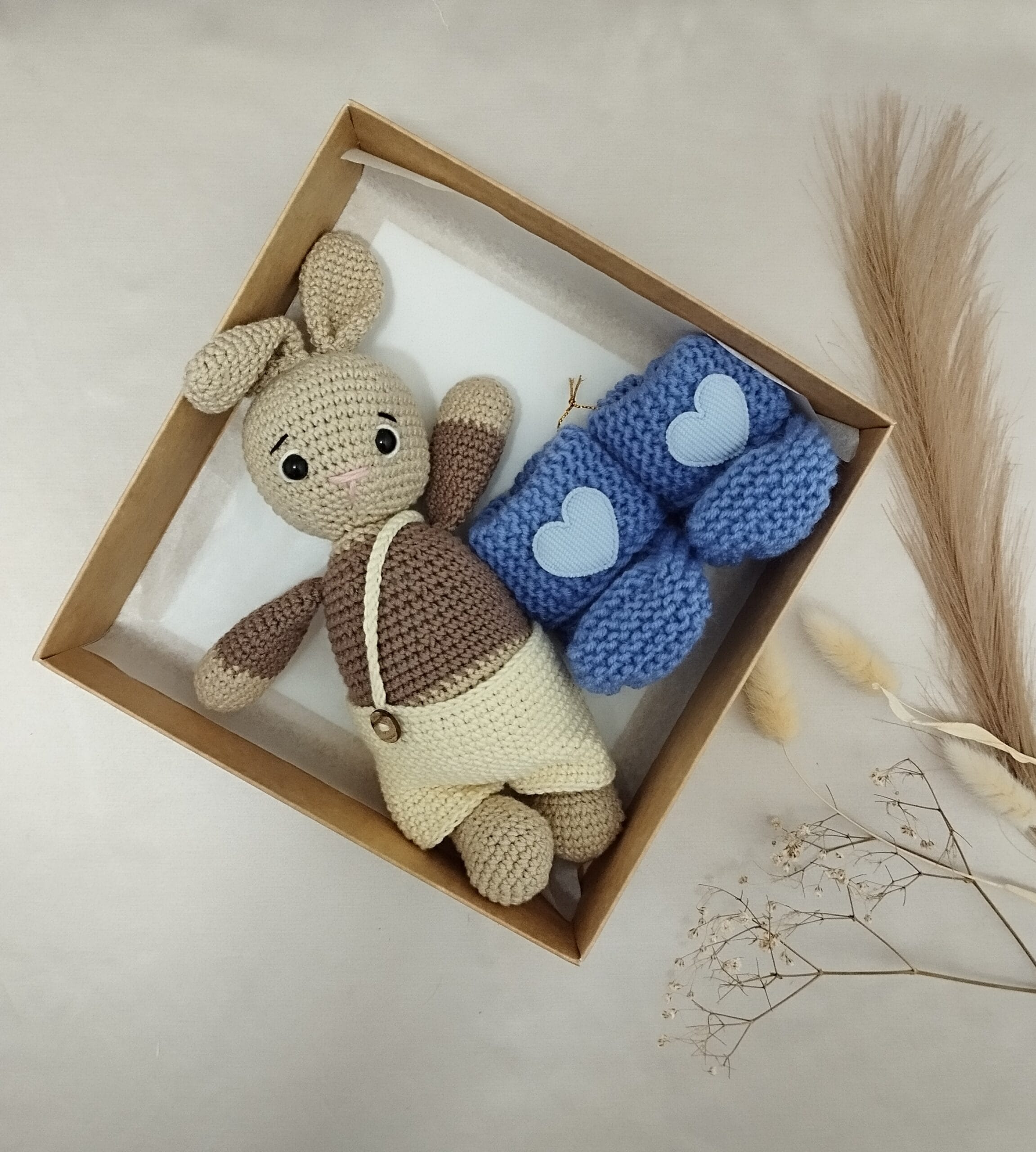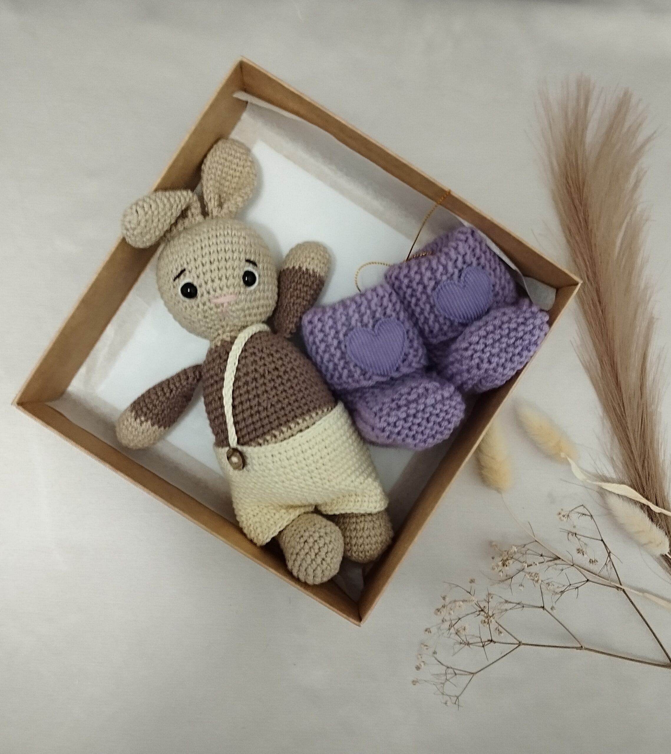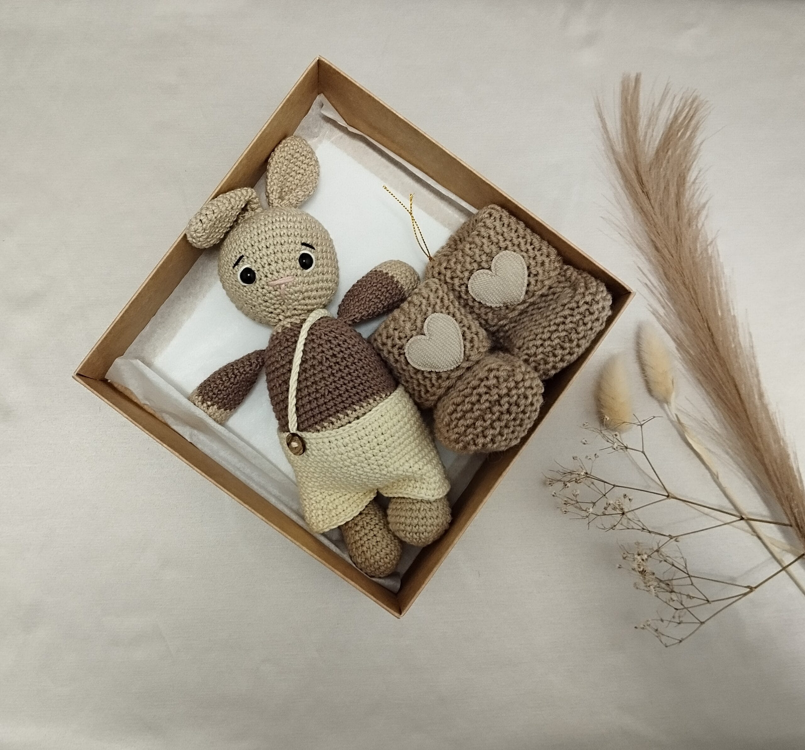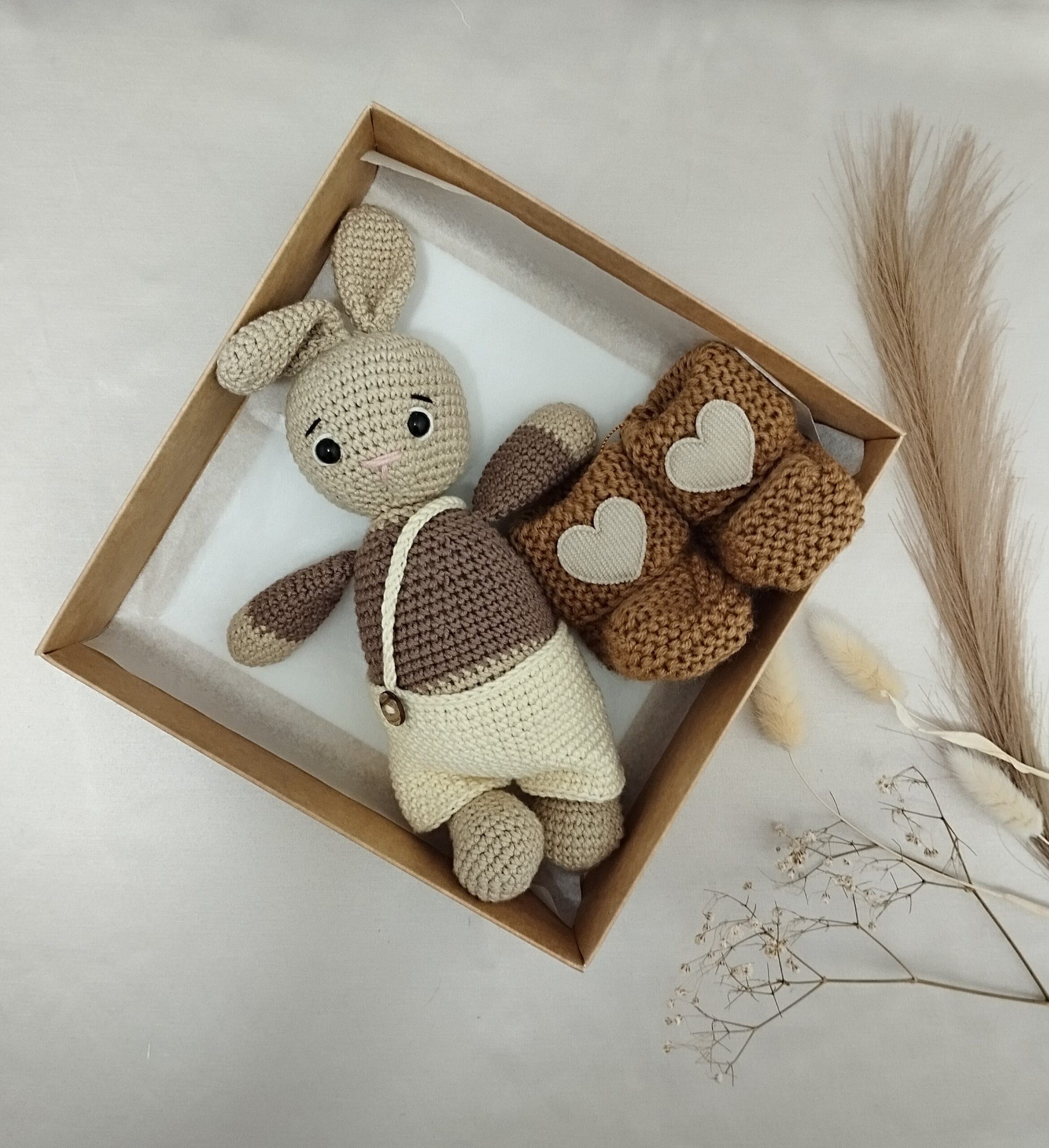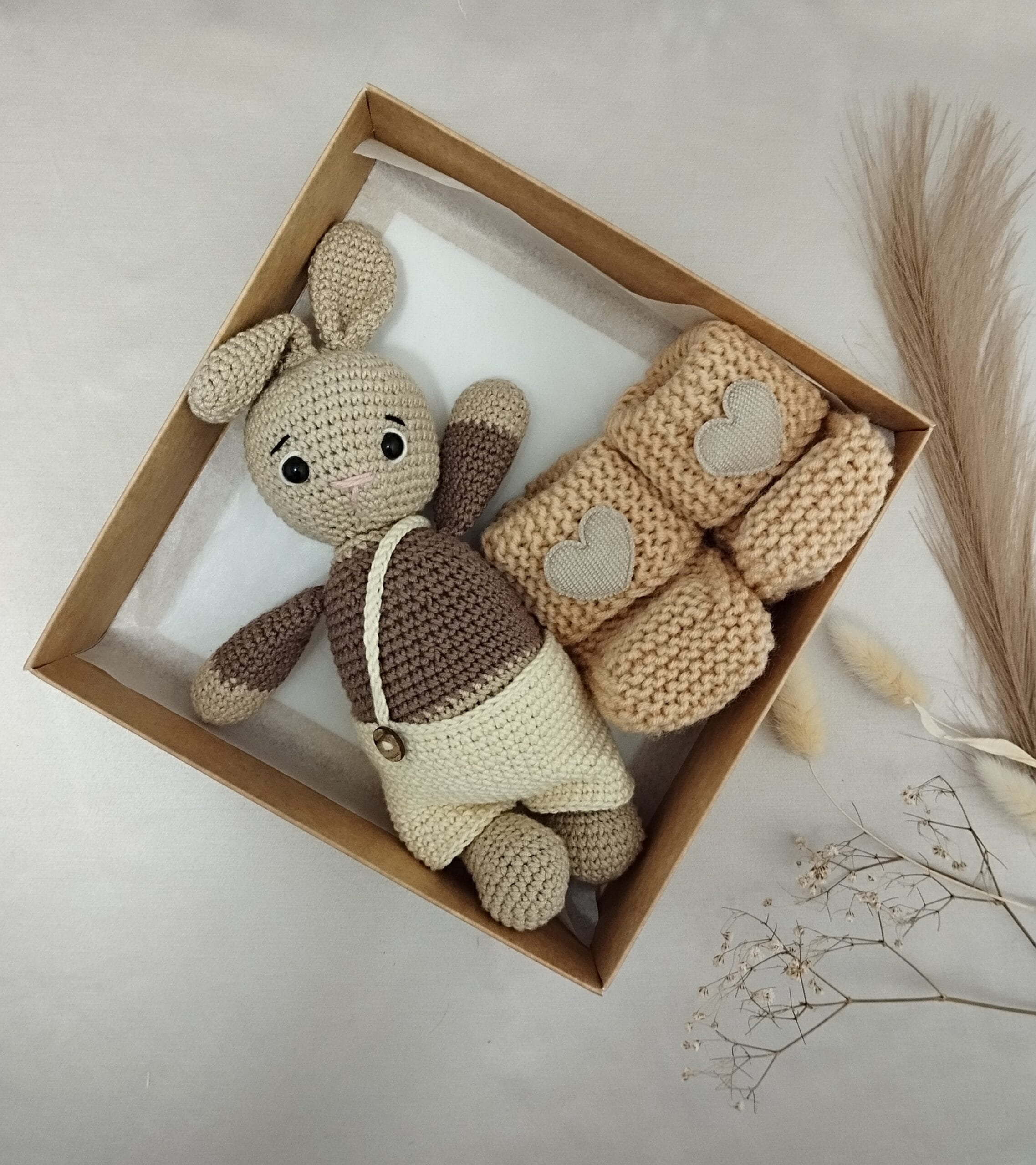 Rudo Kiškučio su tapukais rinkinys pagamintas iš natūralių, odai draugiškų medžiagų, todėl tinka net jautriausios odelės kūdikiams. Švelnumas, tvarumas ir rankų darbo meistrystė paverčia šį rinkinį gražia dovana, kupina tikrumo ir šilumos.